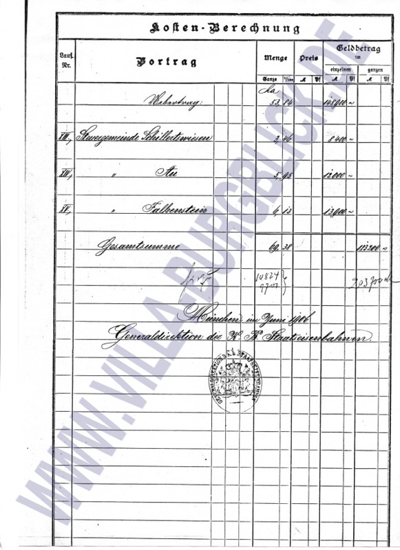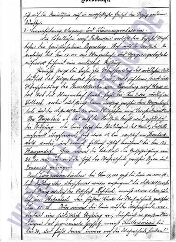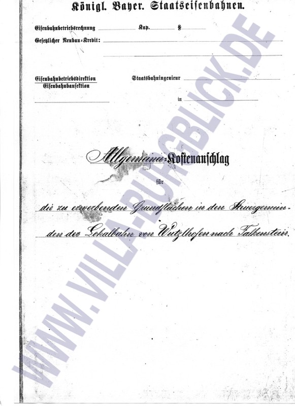 „Nachstehend sind die Kosten einer Lokalbahn von Wutzlhofen nach Falkenstein auf Gund eines alllgemeinen Entwurfes basierend. Die Bearbeitung des Entwurfes erfolgte auf Rechnung der Interessenten.“
