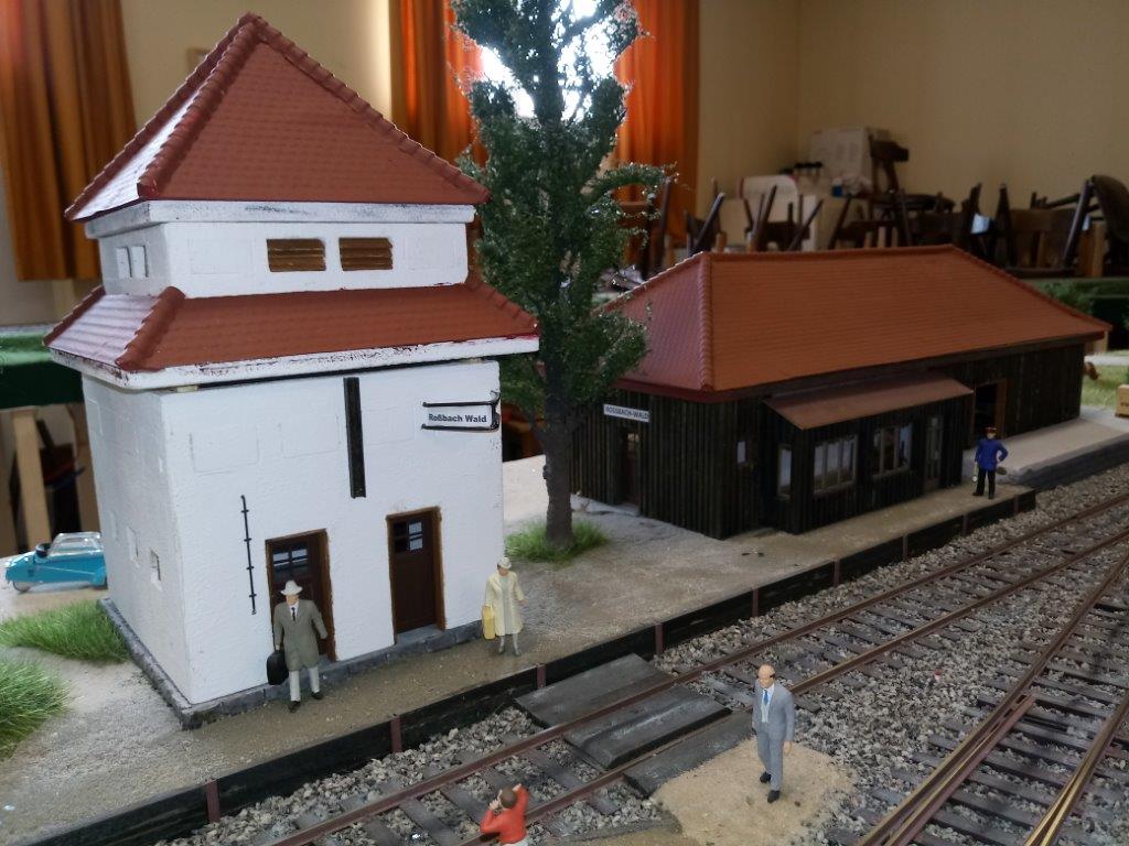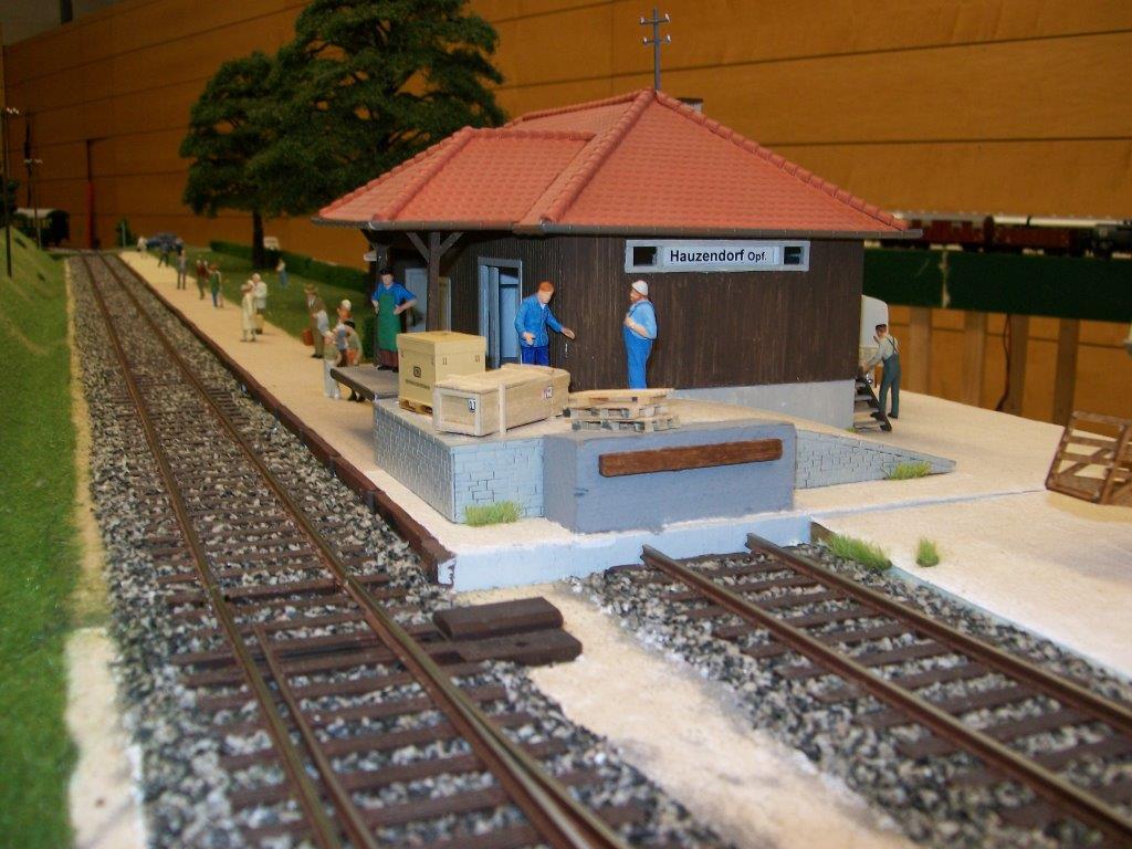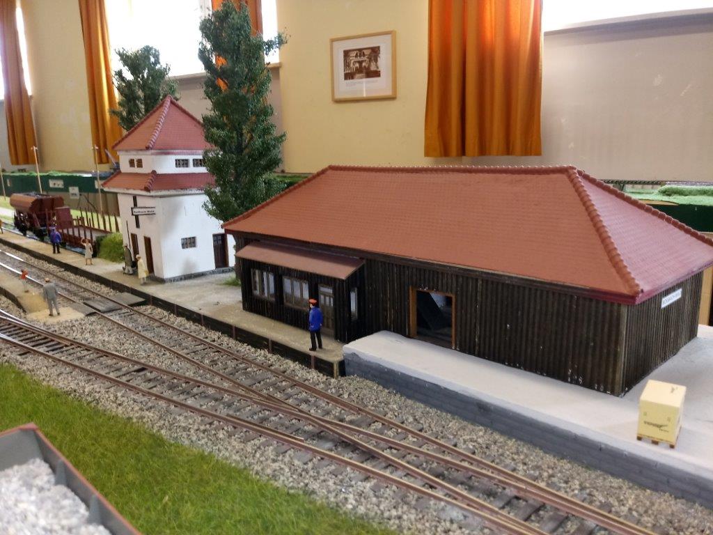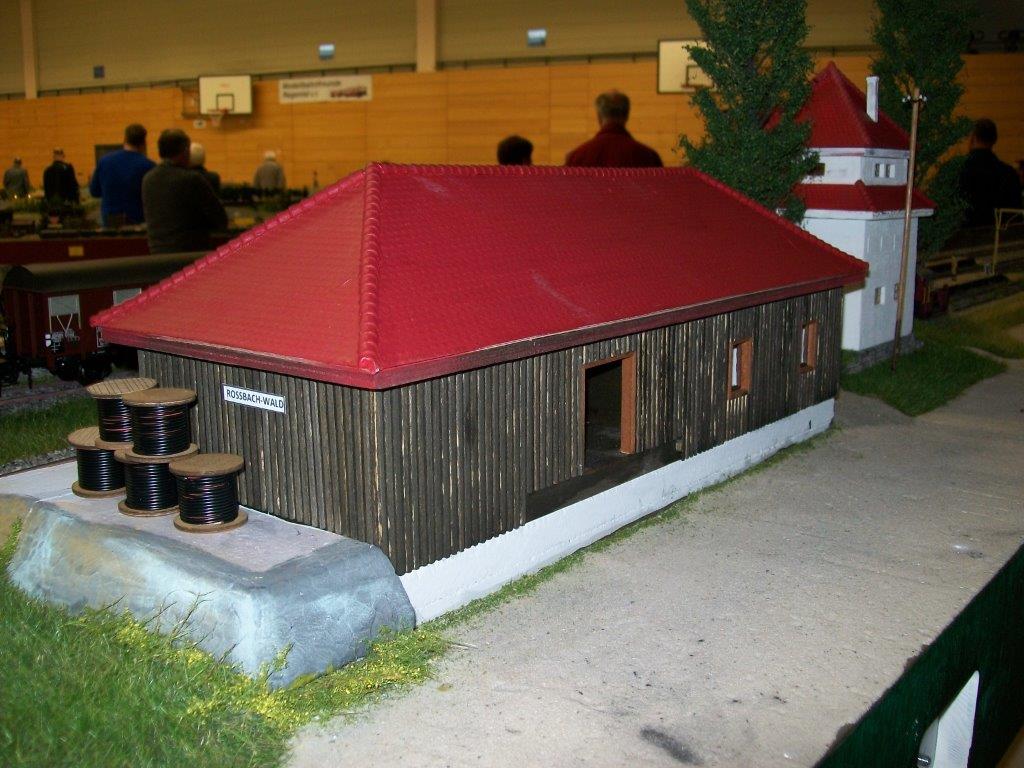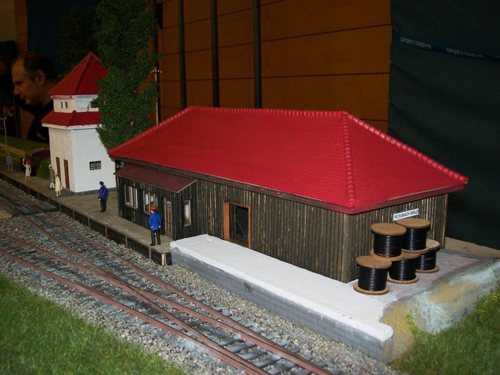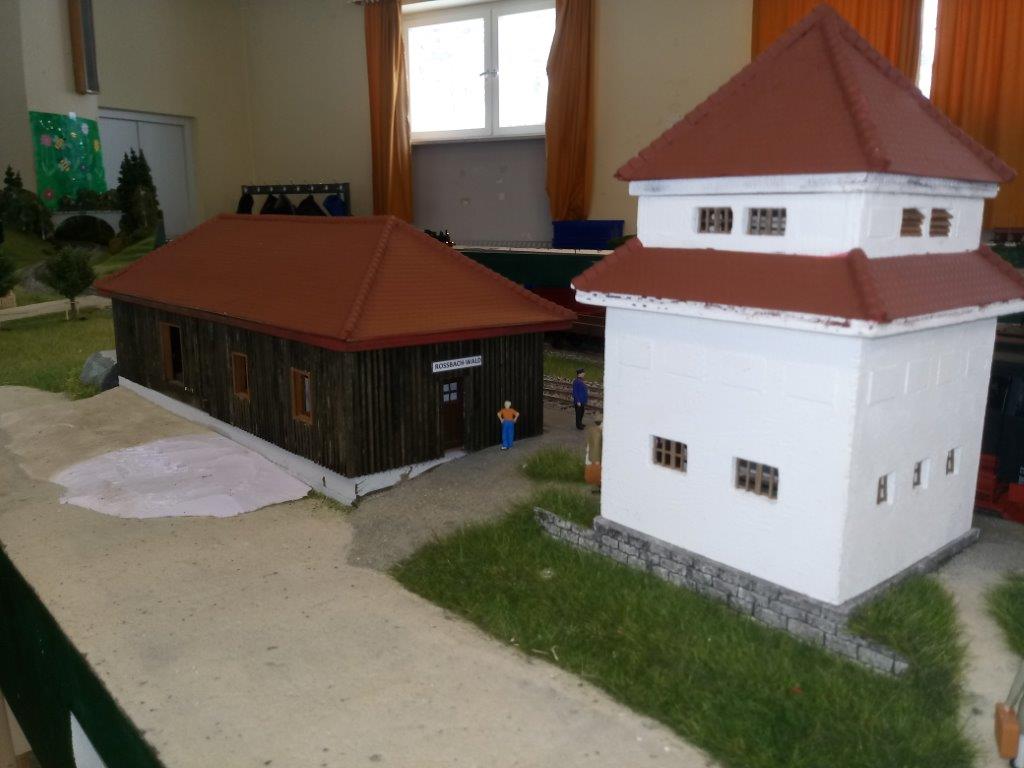 Bilder der Modellbahnanlage von den Regensburger Straßenbahn-, Walhallabahn und eisenbahnfreunden (RSWE e.V.), mit Nachbauten der Bahnhöfe Hauzendorf und R0ßbach, sowie des Streckenabschnitts mit der Bogenbrücke westlich von Roßbach. Ebenfalls ausgeführt in Spur 0 / Maßstab 1:45