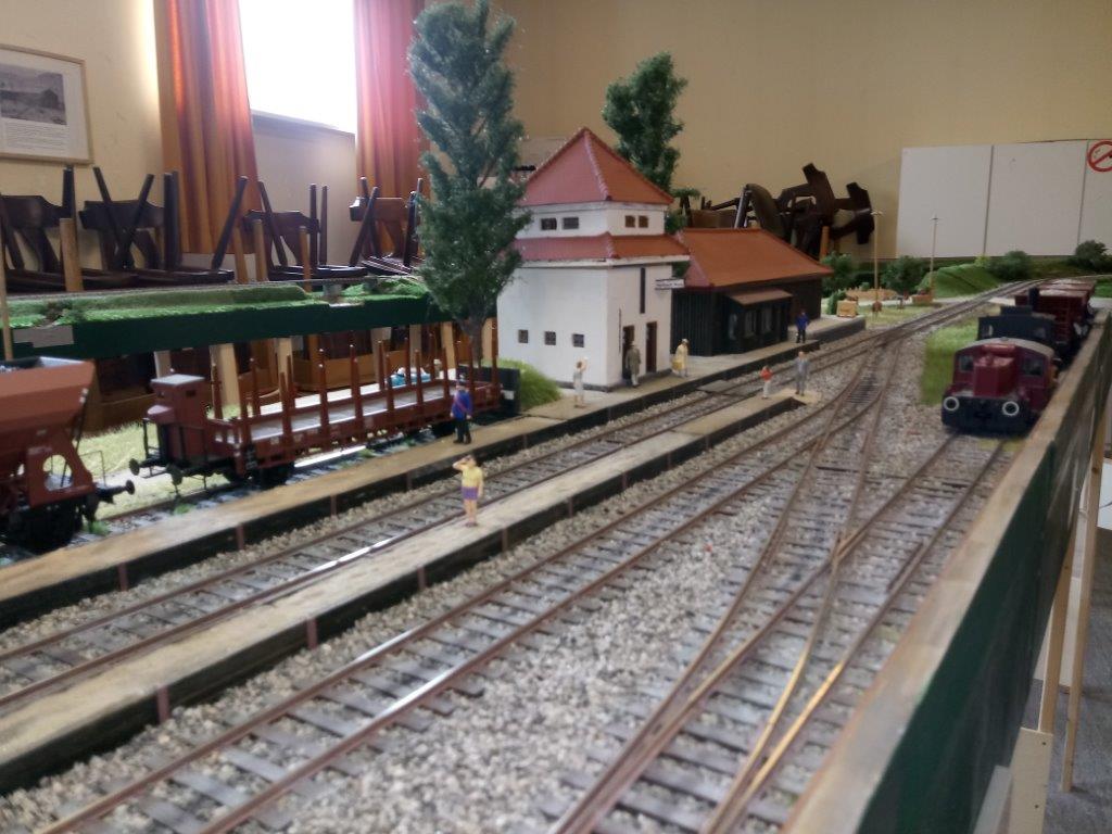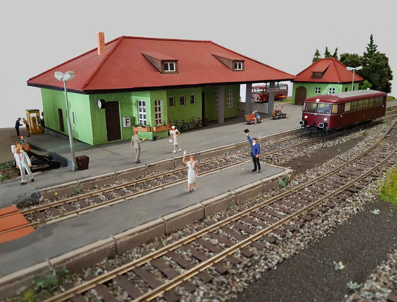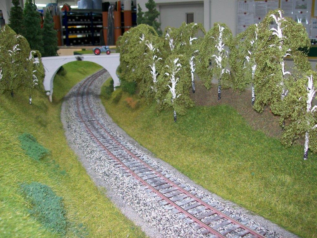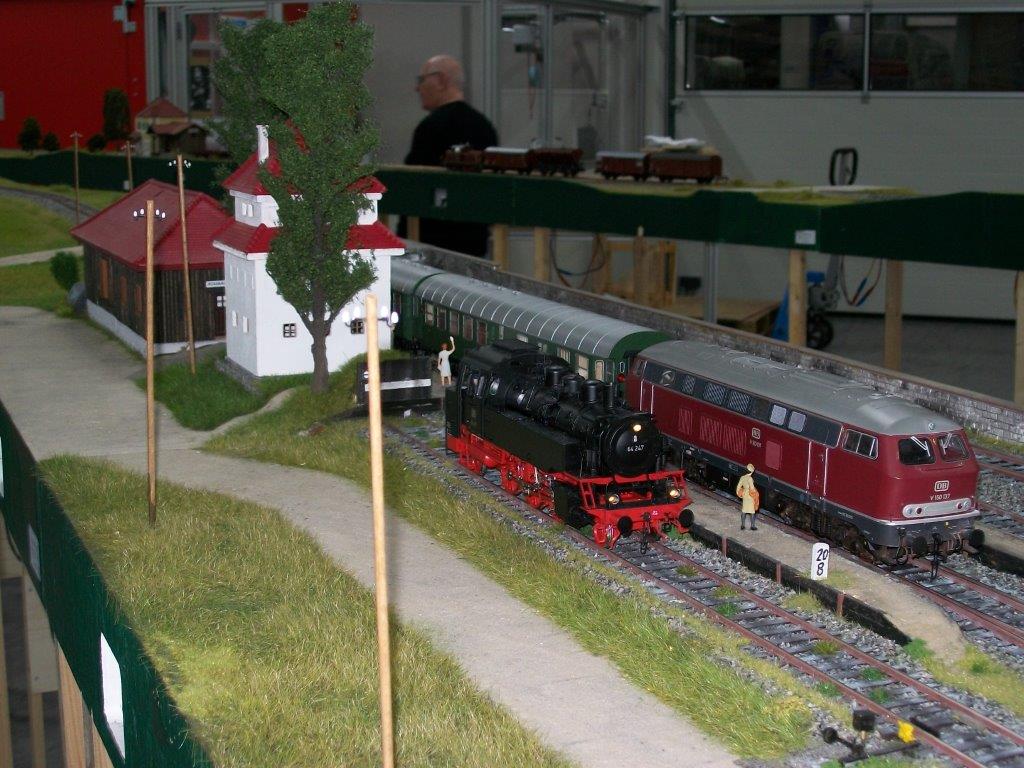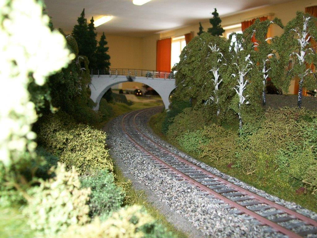 Bilder der Modellbahnanlage von den Regensburger Straßenbahn-, Walhallabahn und eisenbahnfreunden (RSWE e.V.), mit Nachbauten der Bahnhöfe Hauzendorf und R0ßbach, sowie des Streckenabschnitts mit der Bogenbrücke westlich von Roßbach. Ebenfalls ausgeführt in Spur 0 / Maßstab 1:45