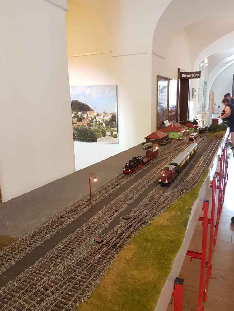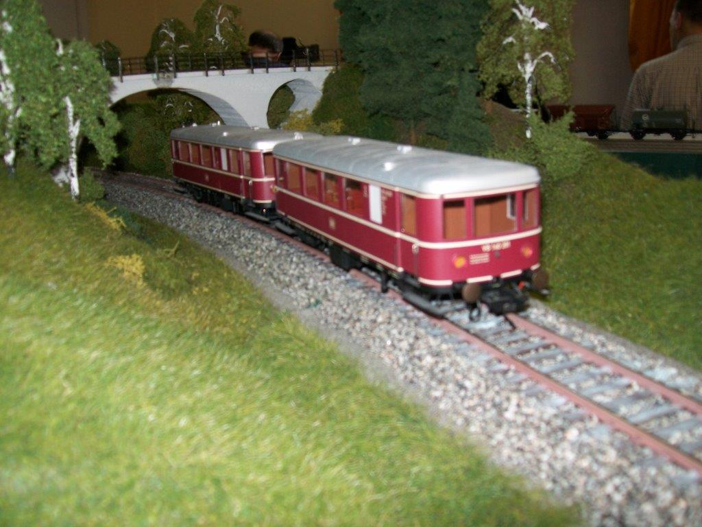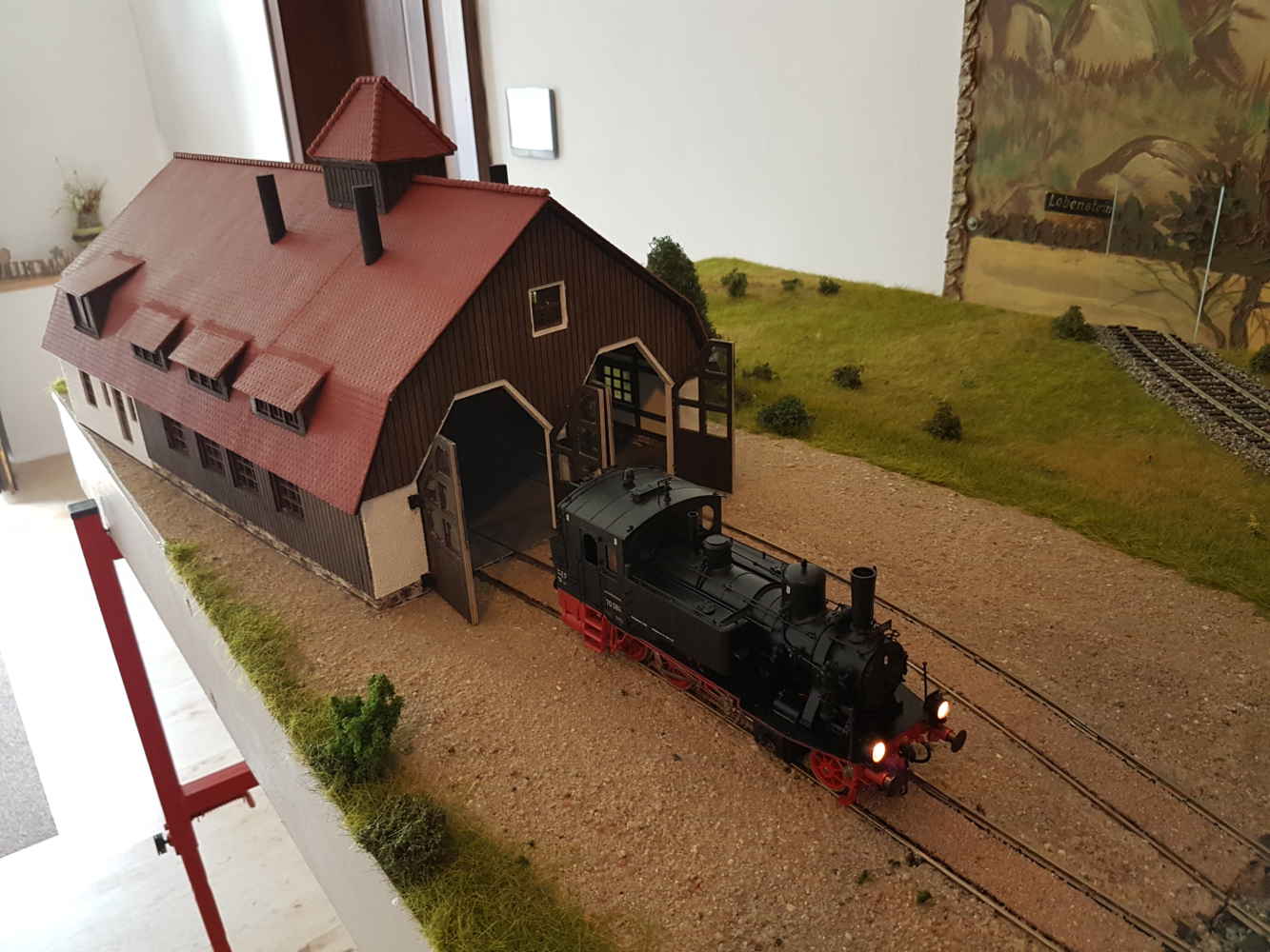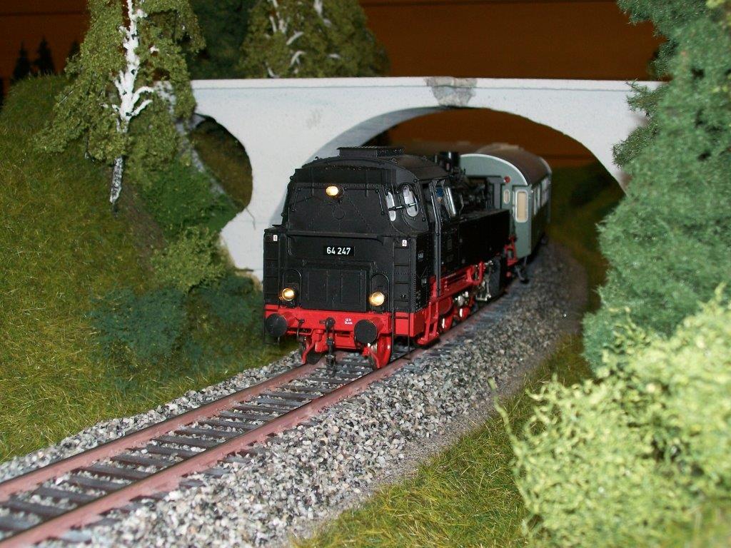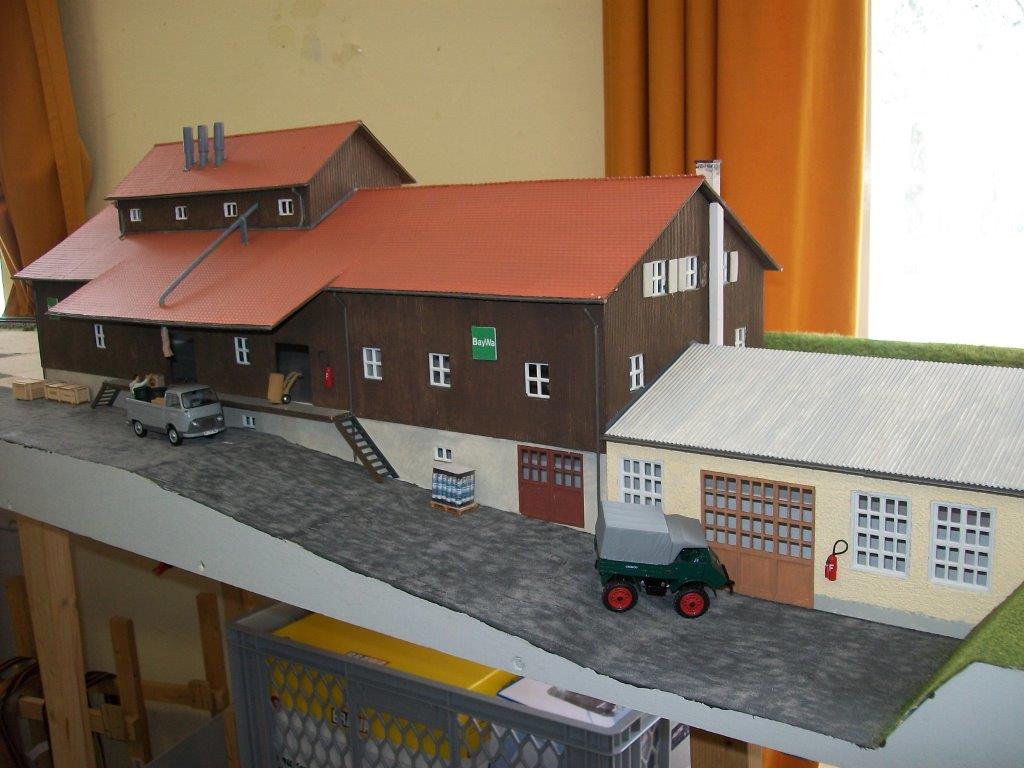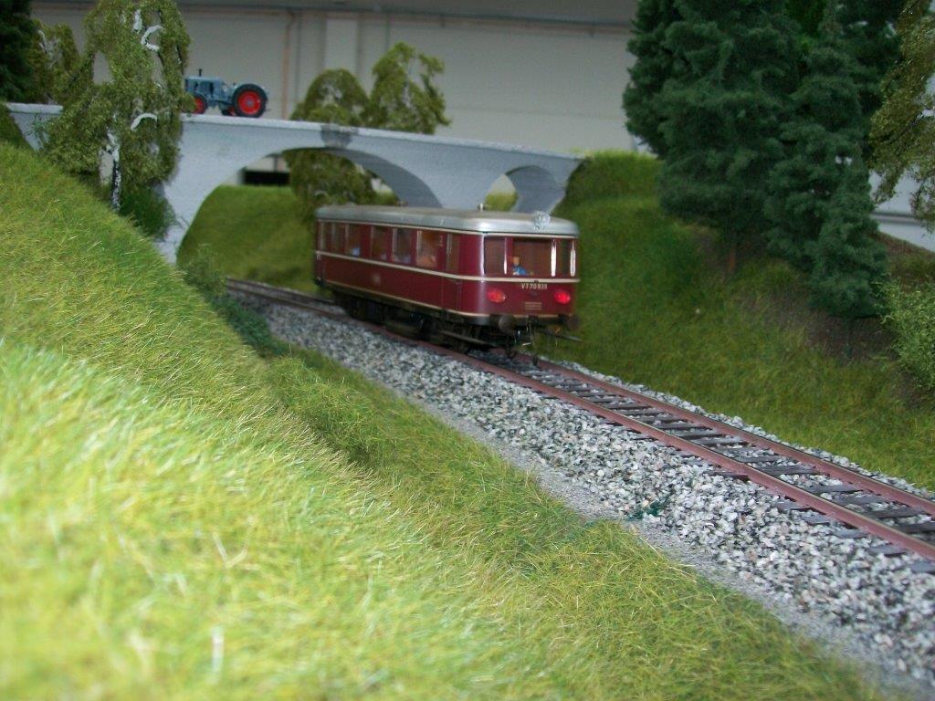Bilder der Modellbahnanlage von den Regensburger Straßenbahn-, Walhallabahn und eisenbahnfreunden (RSWE e.V.), mit Nachbauten der Bahnhöfe Hauzendorf und R0ßbach, sowie des Streckenabschnitts mit der Bogenbrücke westlich von Roßbach. Ebenfalls ausgeführt in Spur 0 / Maßstab 1:45